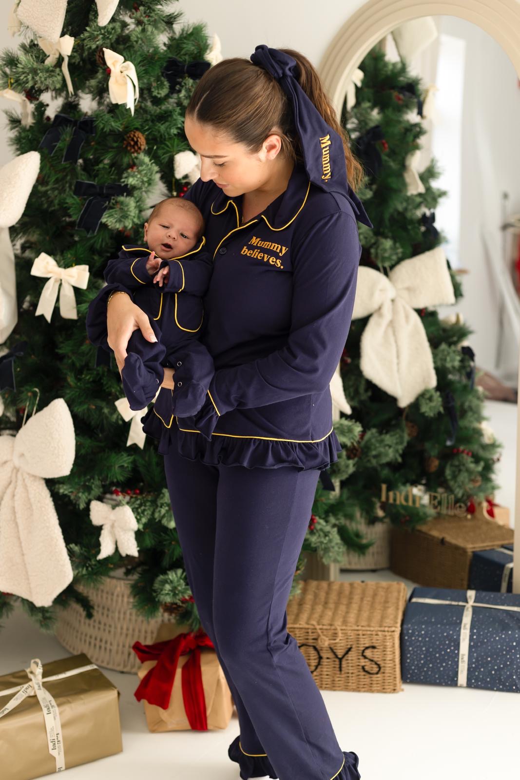 Complete the look with our matching bow, crafted from the same soft navy cotton. Designed to pair perfectly with ourΒ Navy Christmas 2025 Collection, it’s the sweetest finishing touch for your little one’s festive outfit.