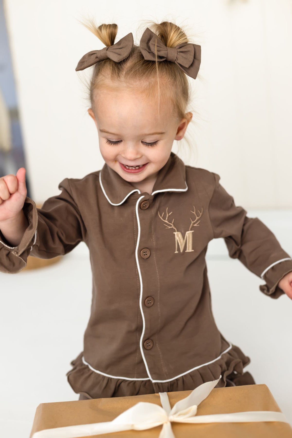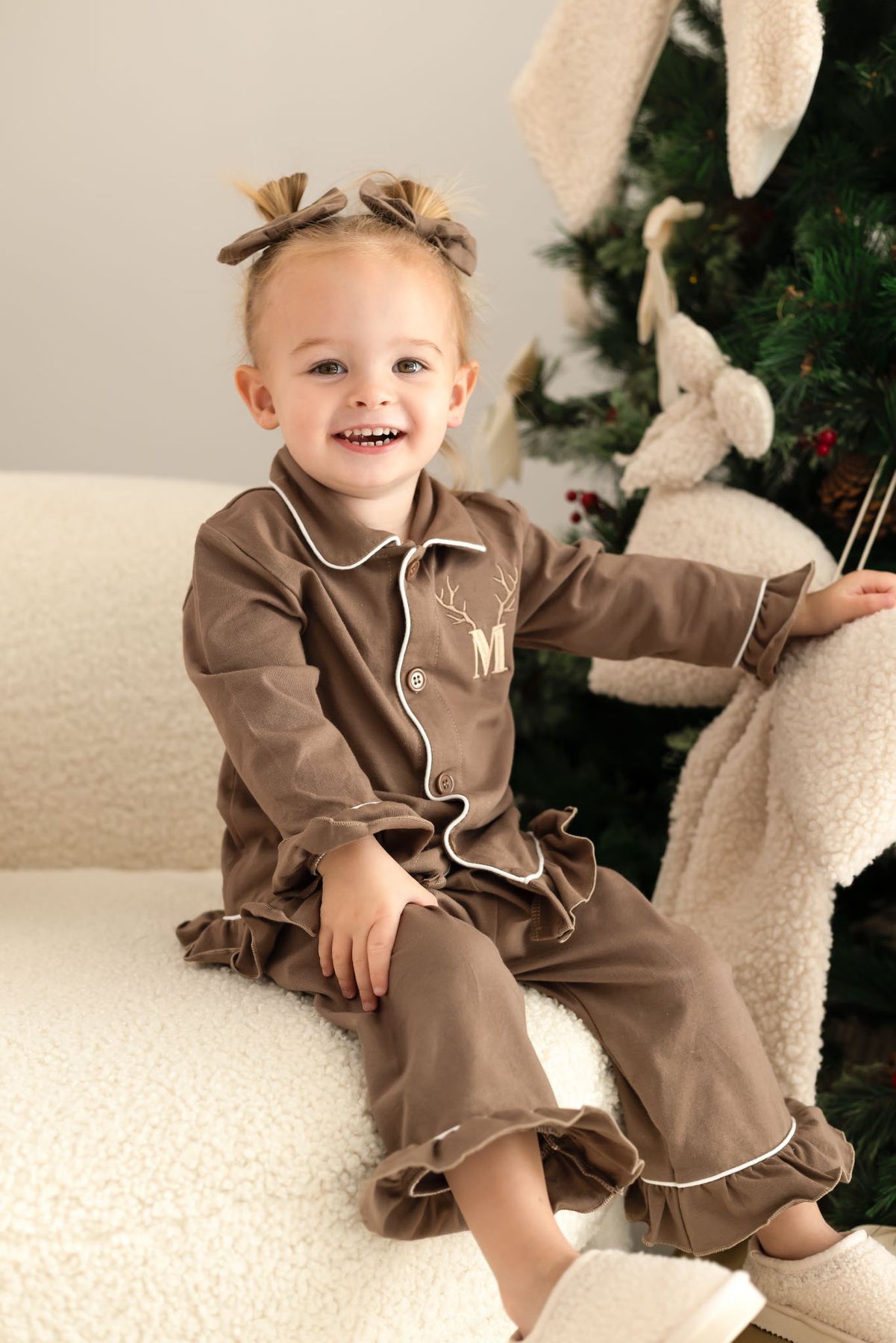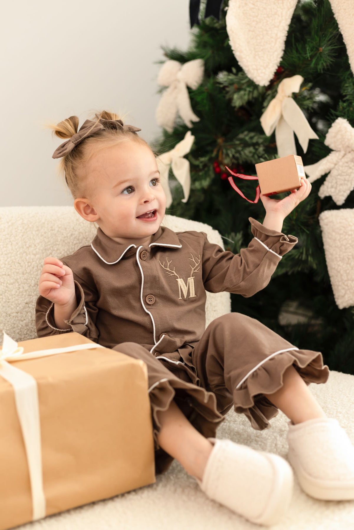 Our brand-new matching family two piece set with FRILL or CLASSIC detailing with our classic antler design intialΒ are perfect for celebrating Christmas together.Β