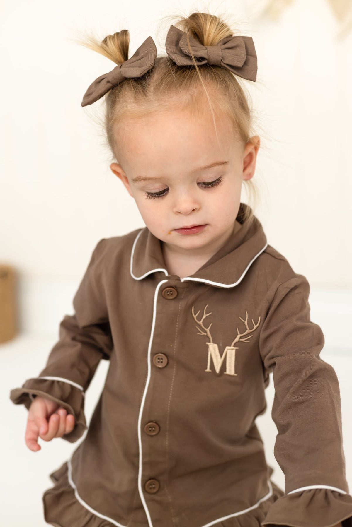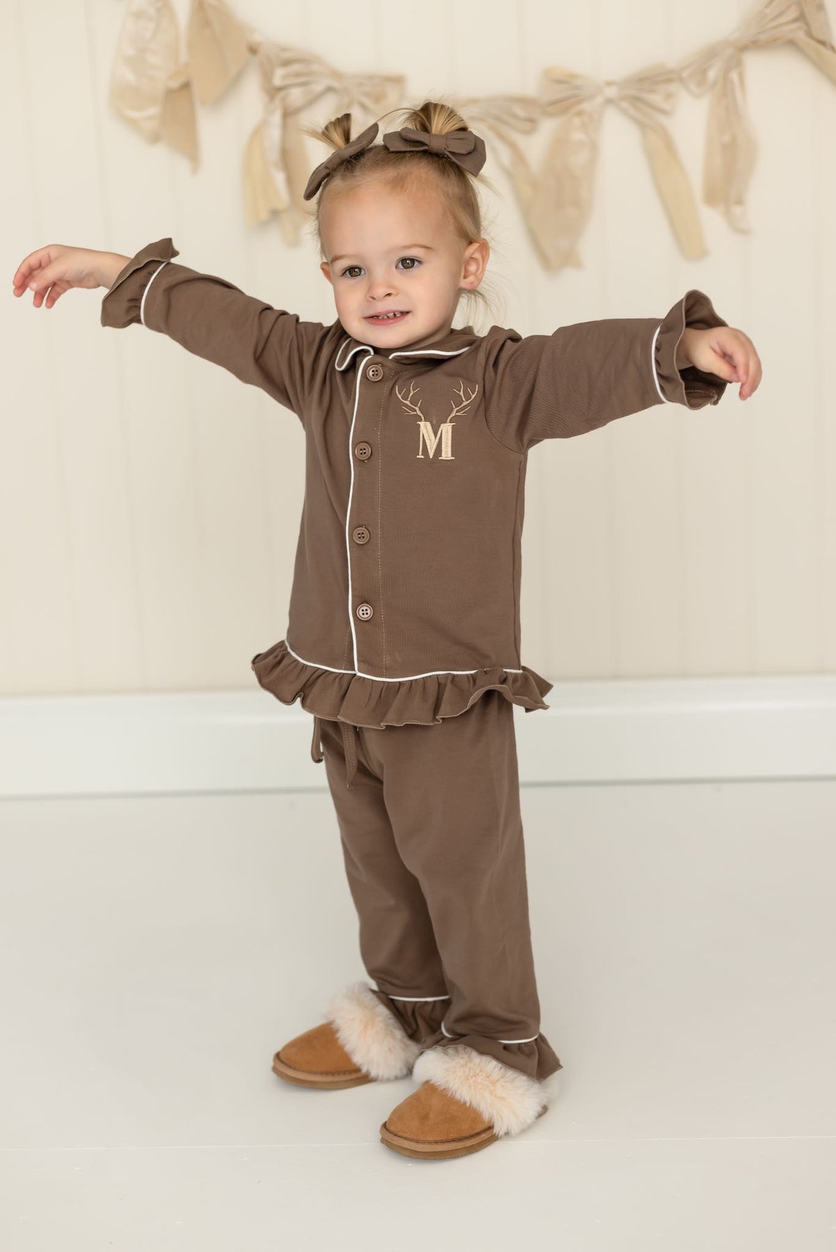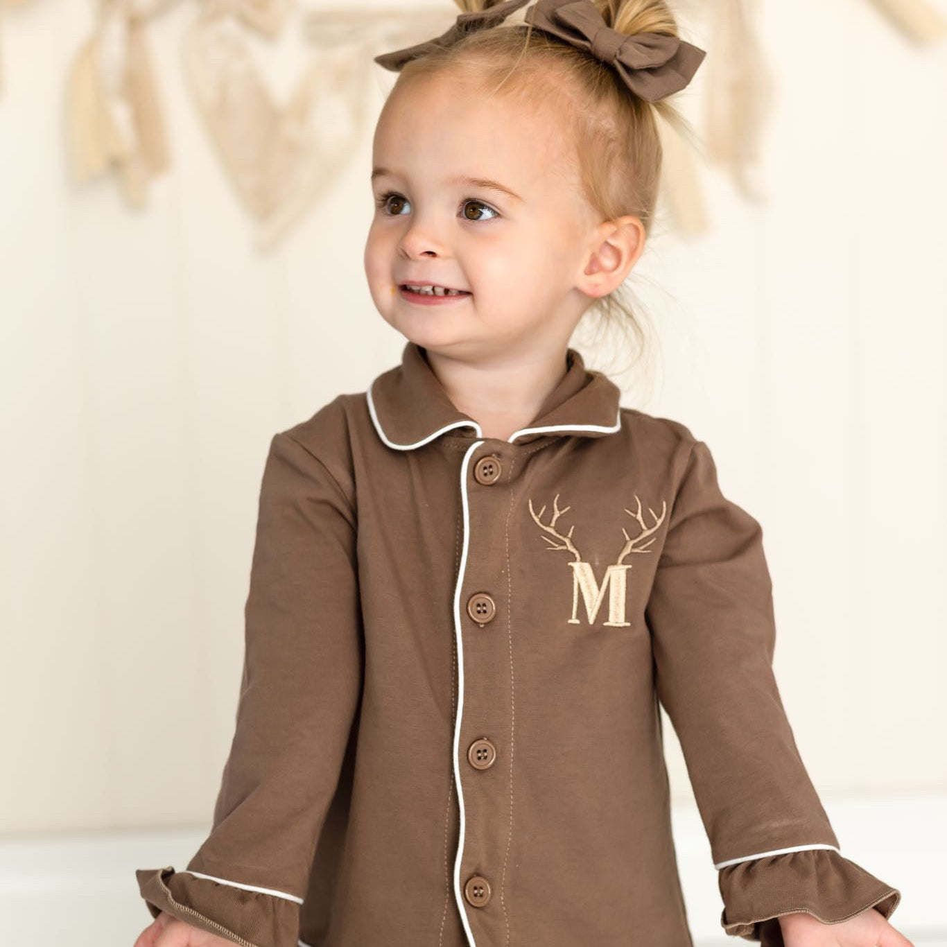 Our brand-new matching family two piece set with FRILL or CLASSIC detailing with our classic antler design intialΒ are perfect for celebrating Christmas together.Β