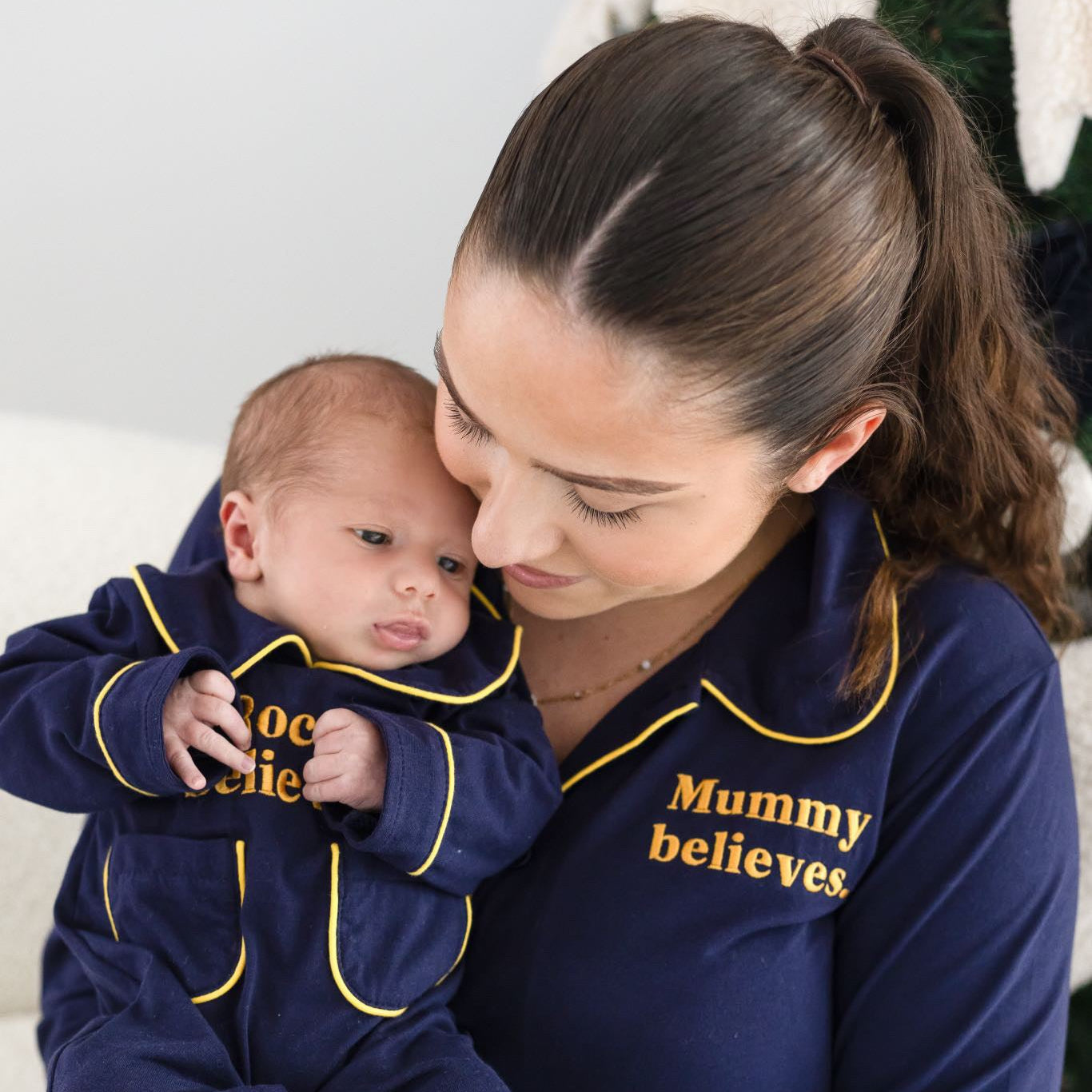 Celebrate Christmas 2025 in style with our brand-new women’s set, designed to coordinate perfectly with the children’s collection. Crafted in soft navy cotton with a crisp gold trim, this timeless set is finished with personalised embroidery in elegant white thread for a festive yet classic look.