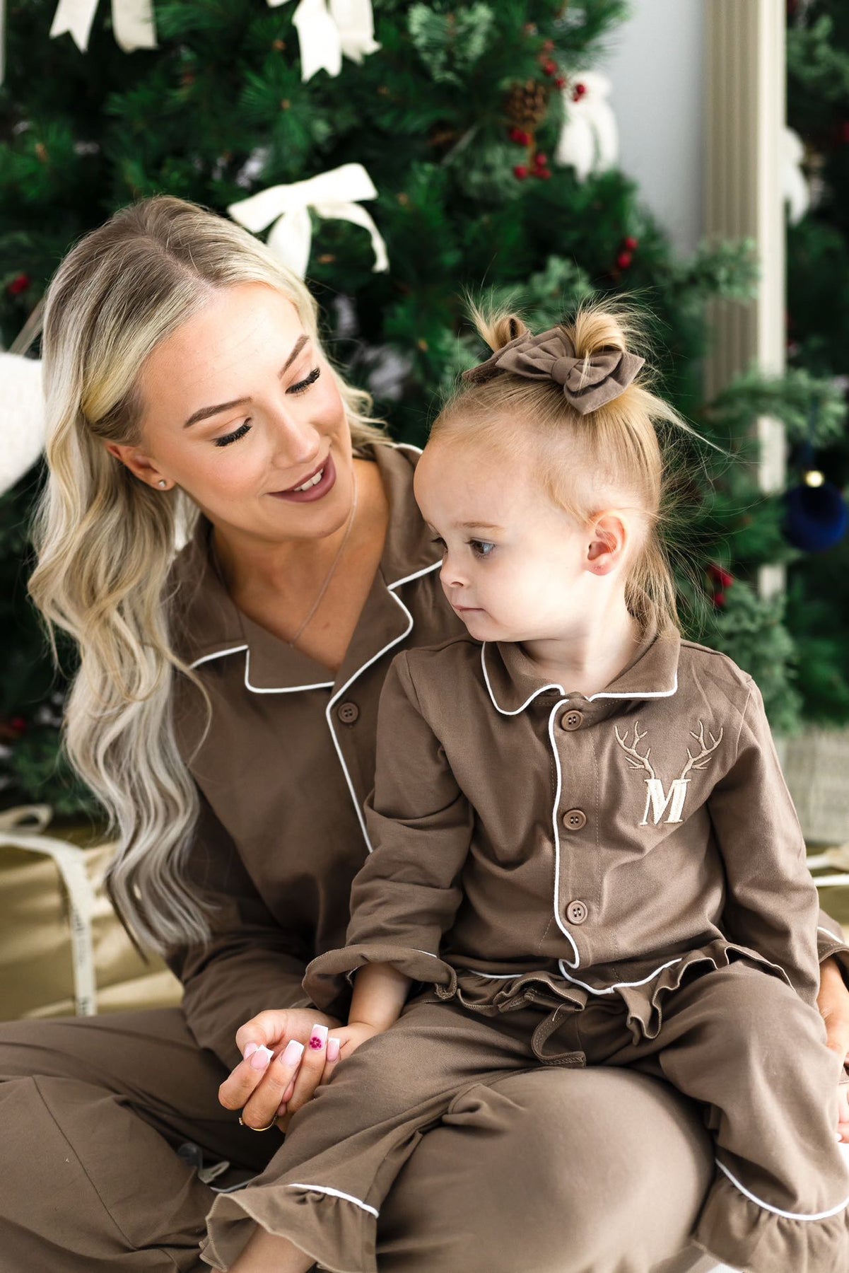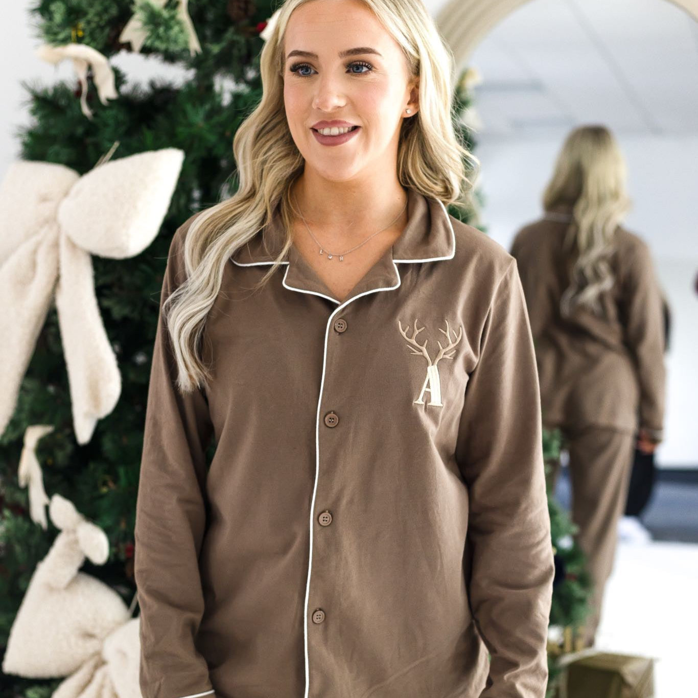 Celebrate Christmas 2025 in style with our brand-new women’s set, designed to coordinate perfectly with the children’s collection. Crafted in soft cappuccino cotton with a crisp white trim, this timeless set is finished with personalised embroidery in elegant white thread for a festive yet classic look.