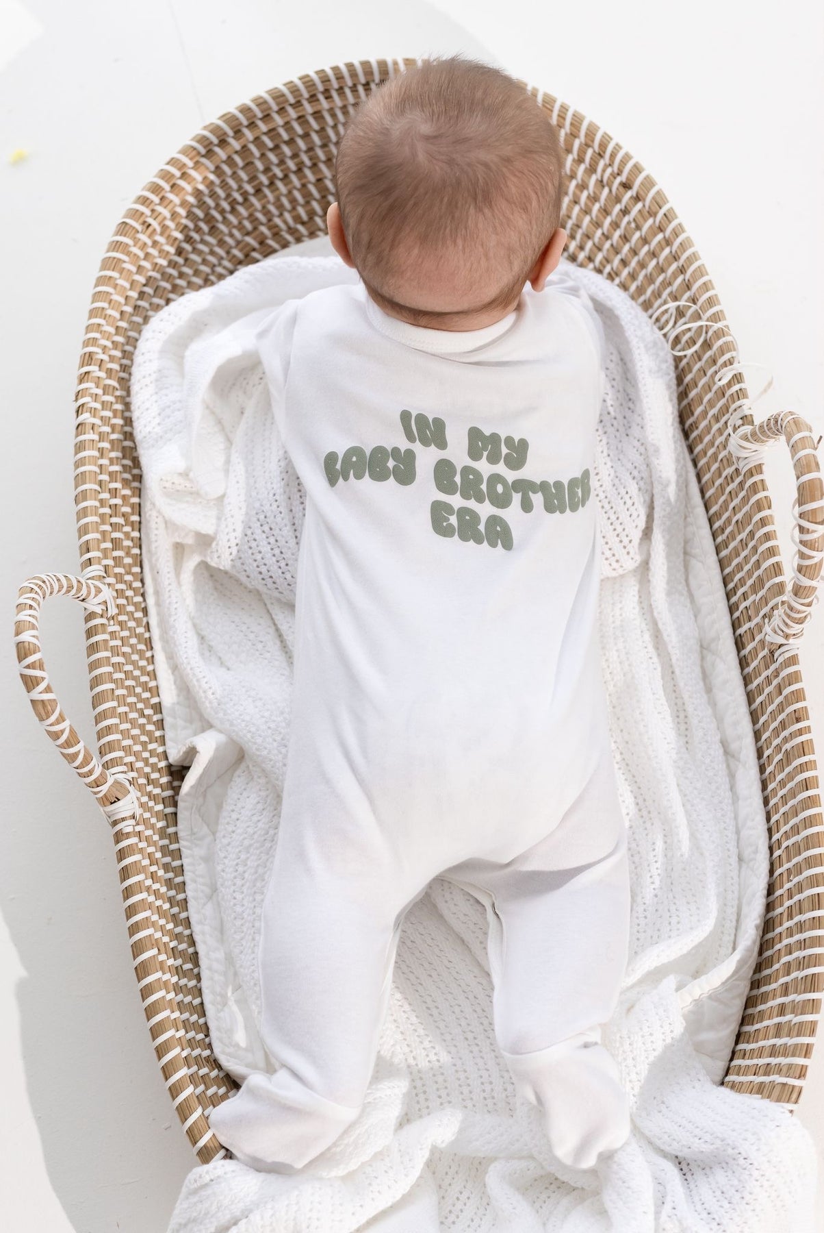 A beautiful classic white romper personalised with a baby sibling era design on both sides.
