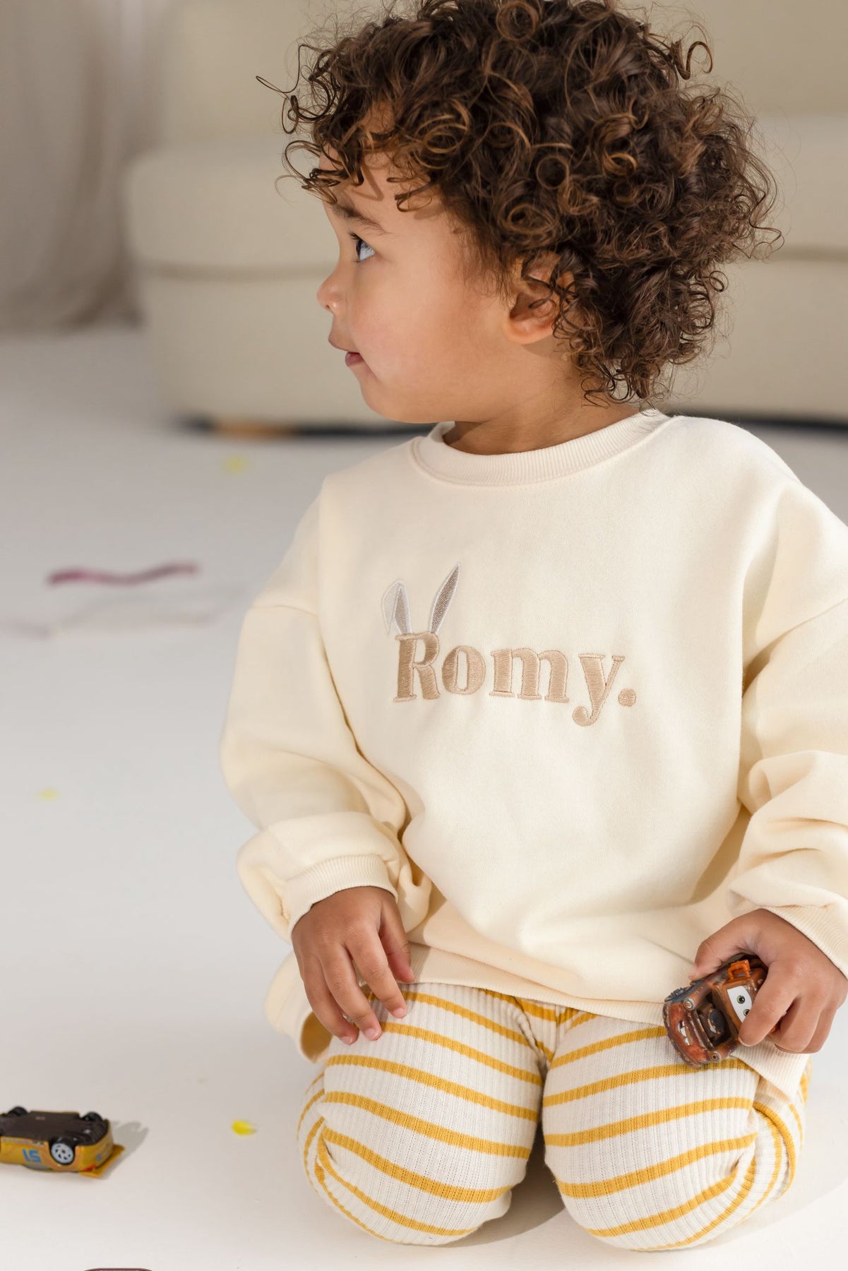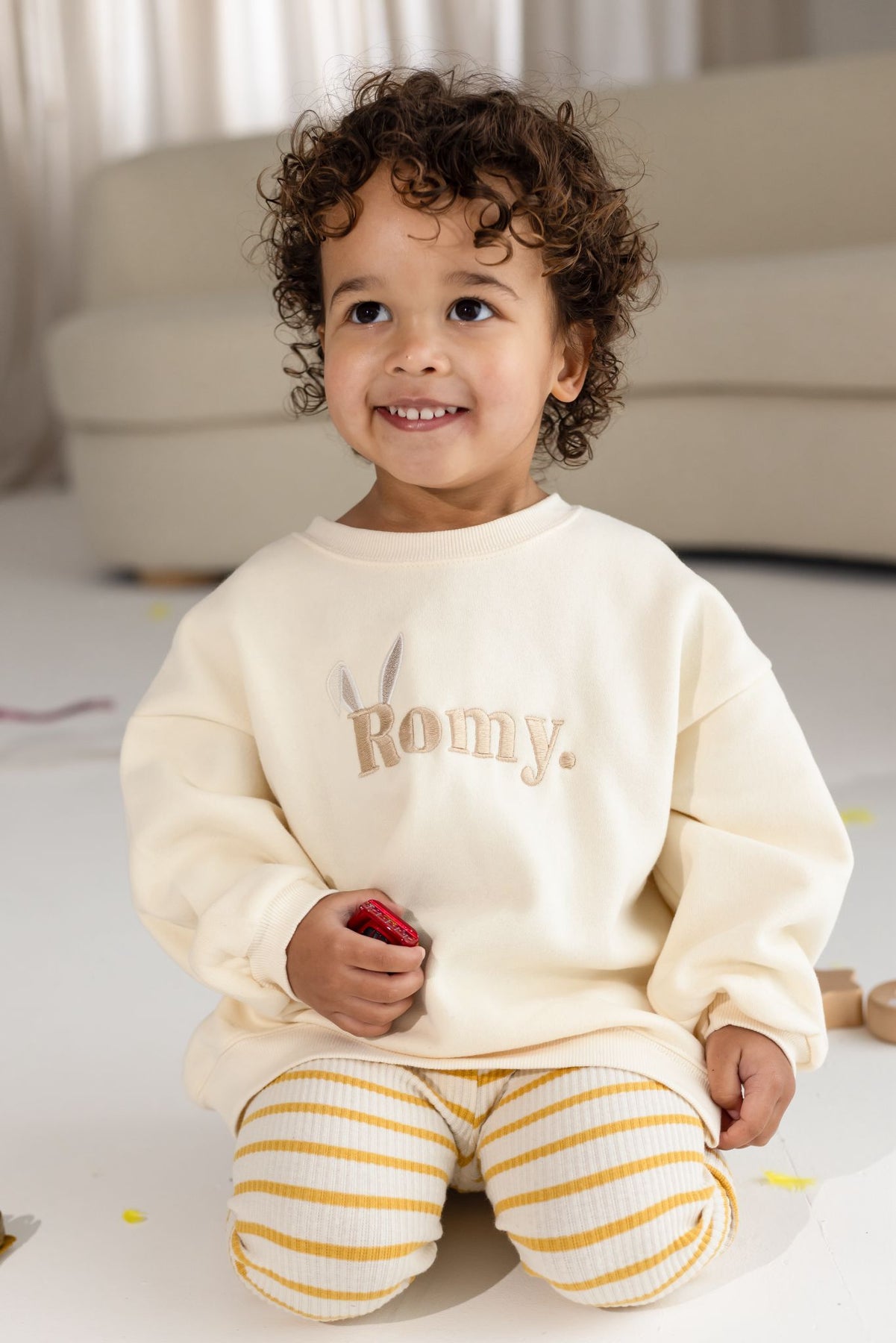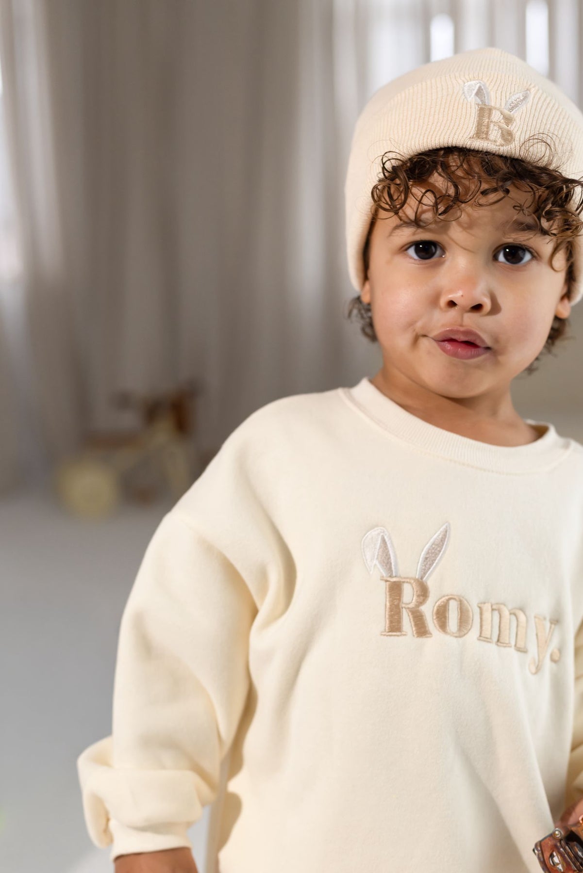 Meet our new Vanilla Jumper, designed with comfort and effortless style in mind. Featuring your little ones name on the front, finished with sweet bunny ears, this piece adds a playful yet timeless touch to a classic wardrobe staple.