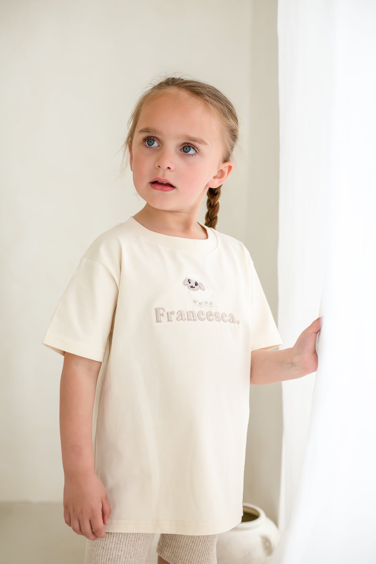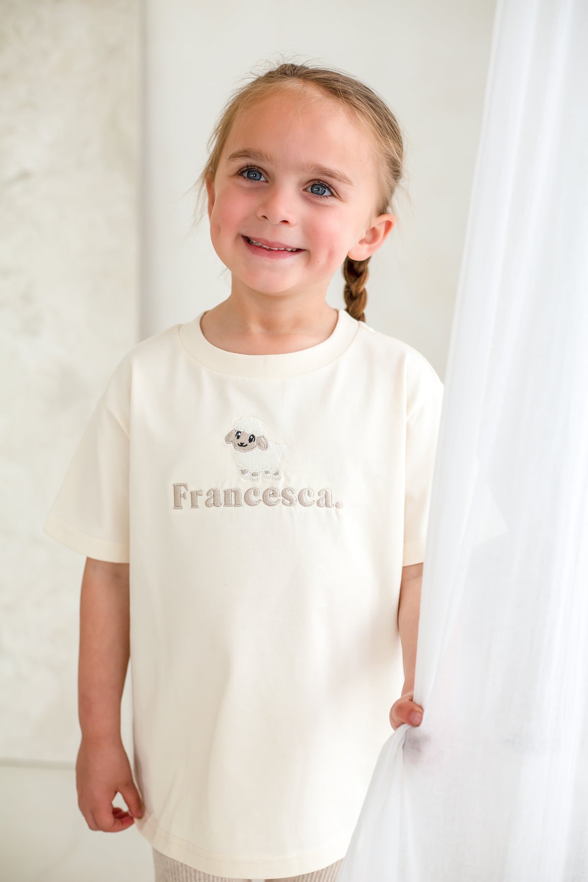 Our brand new thicker premium tshirt in colour Vanilla with our embroidered name and sheep design.
