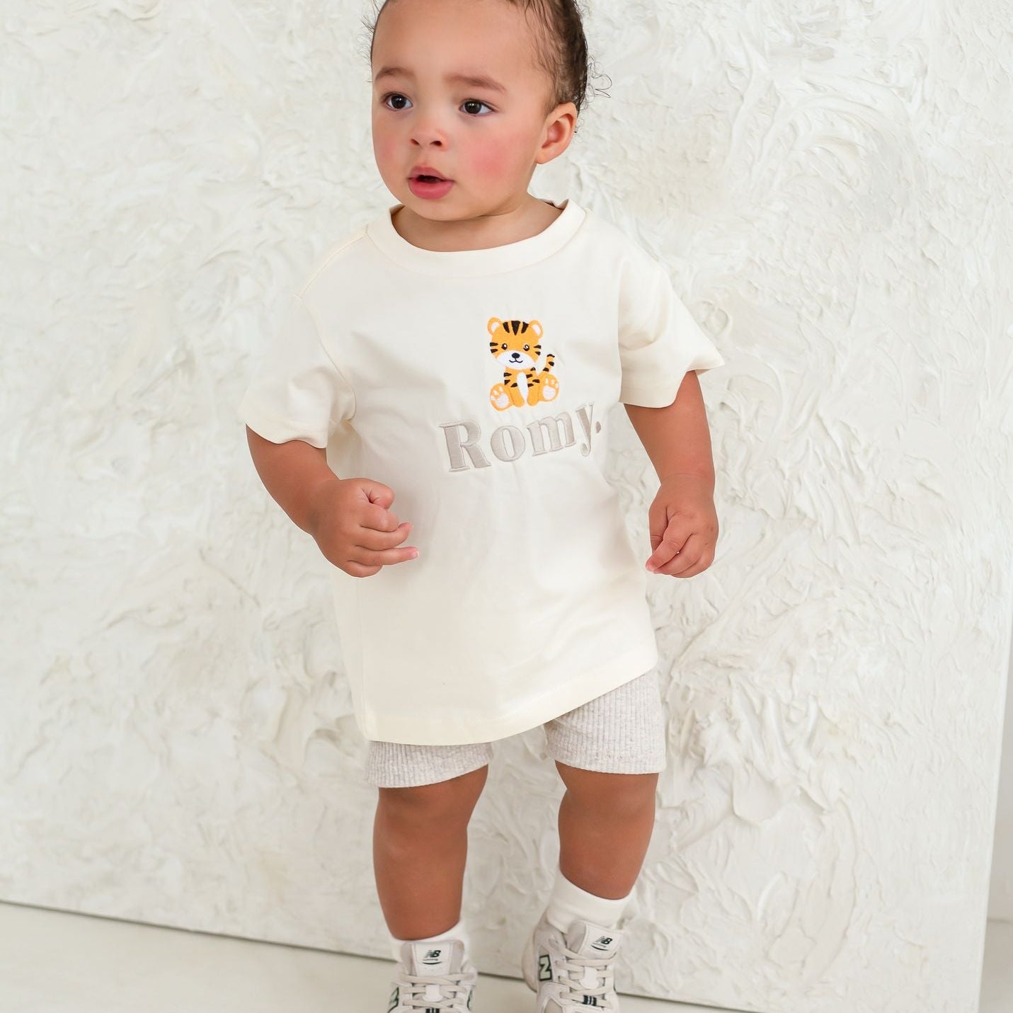 Our brand new thicker premium tshirt in colour Vanilla with our embroidered name and tiger design.