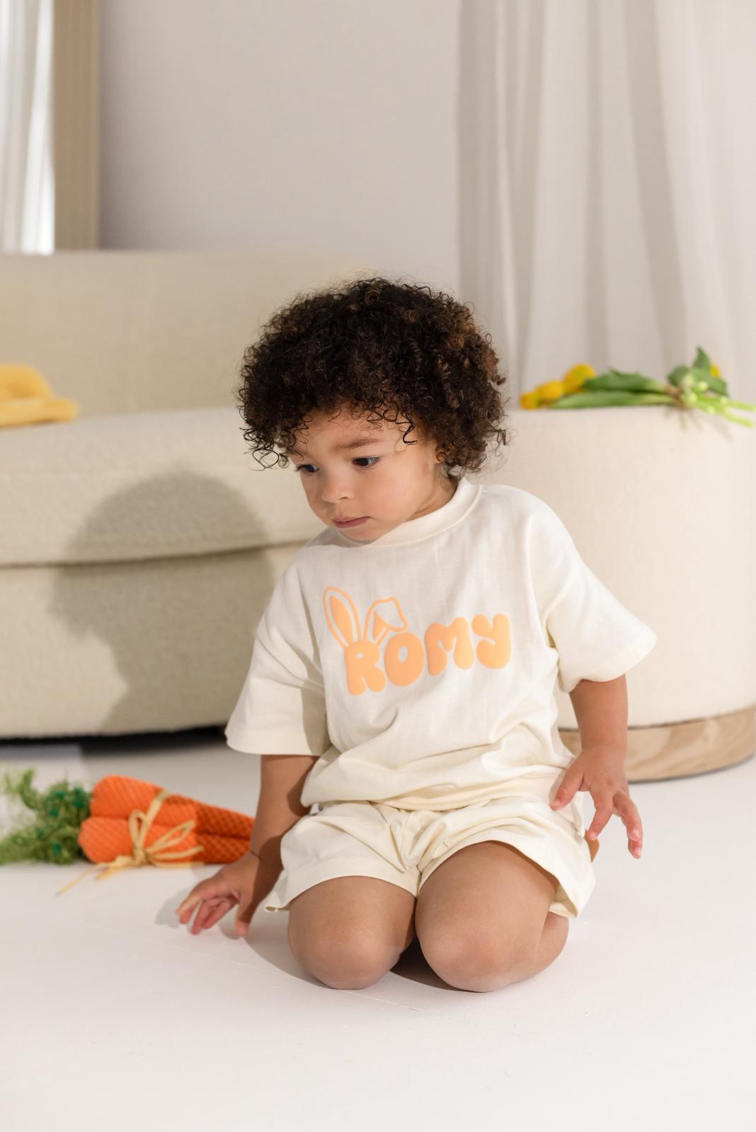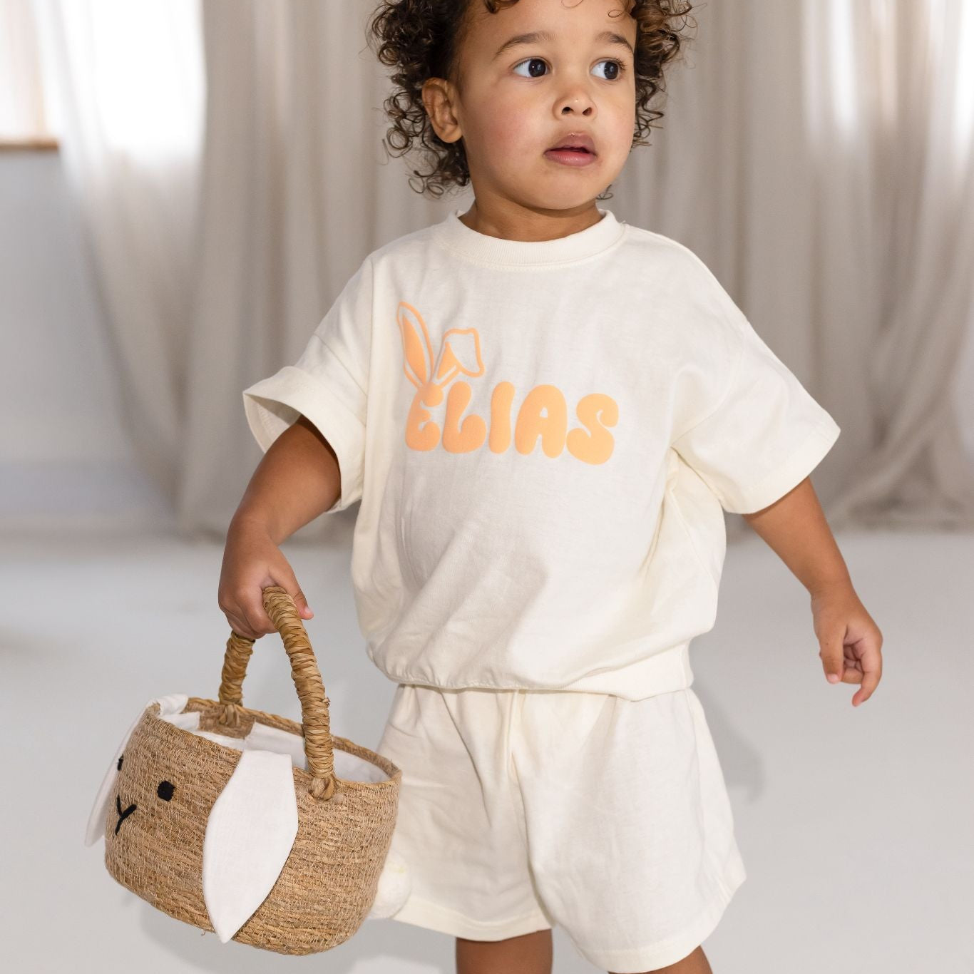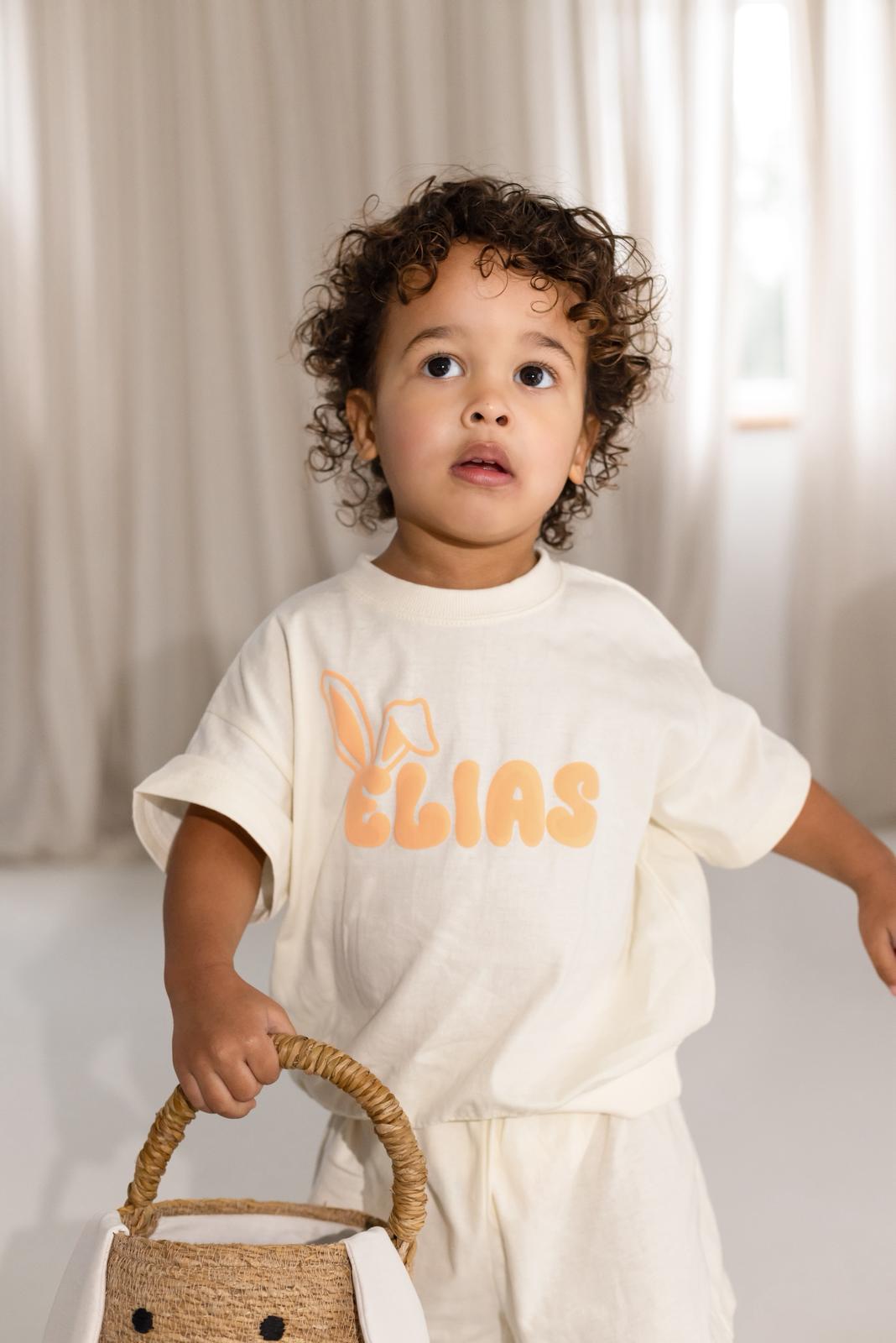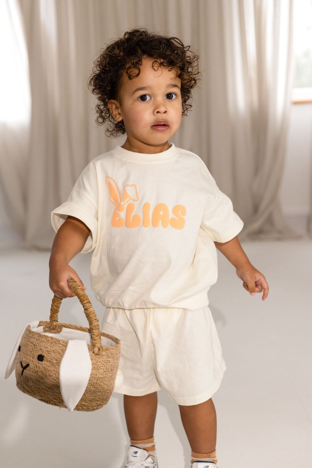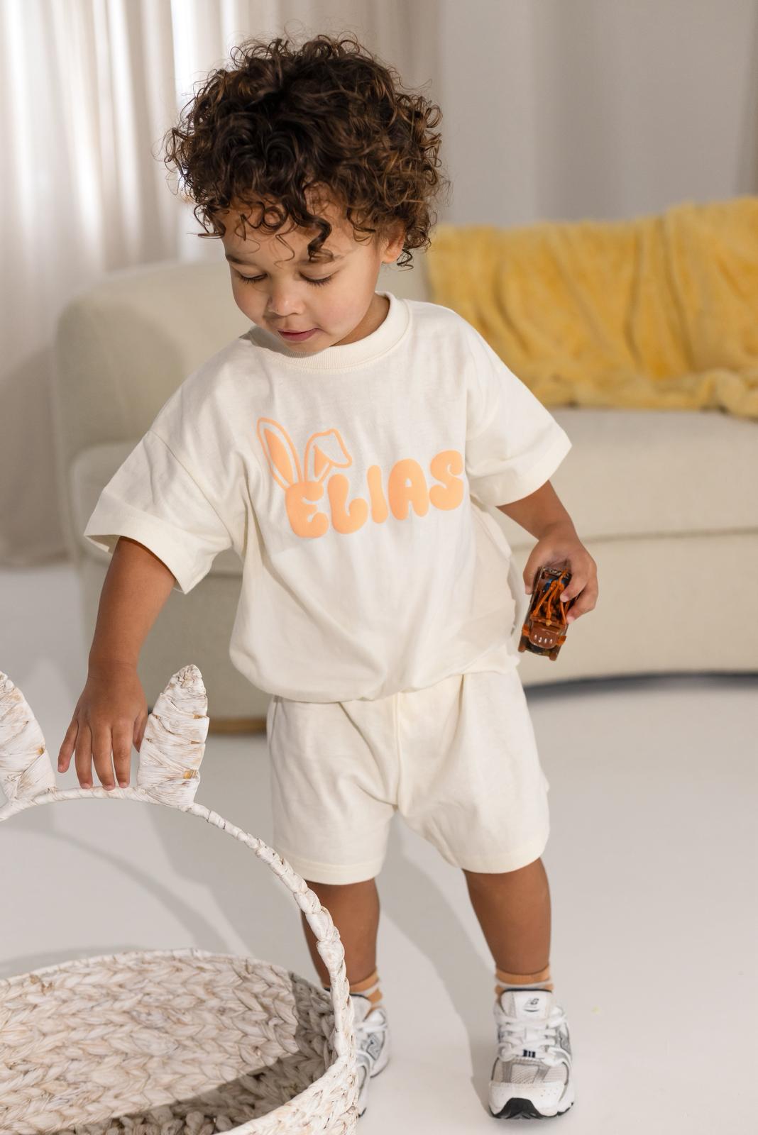 The top features a puff print design in a delicate pastel peach colour, personalised with your child’s name and finished with adorable bunny ears, creating a fun, whimsical look they’ll love to wear.