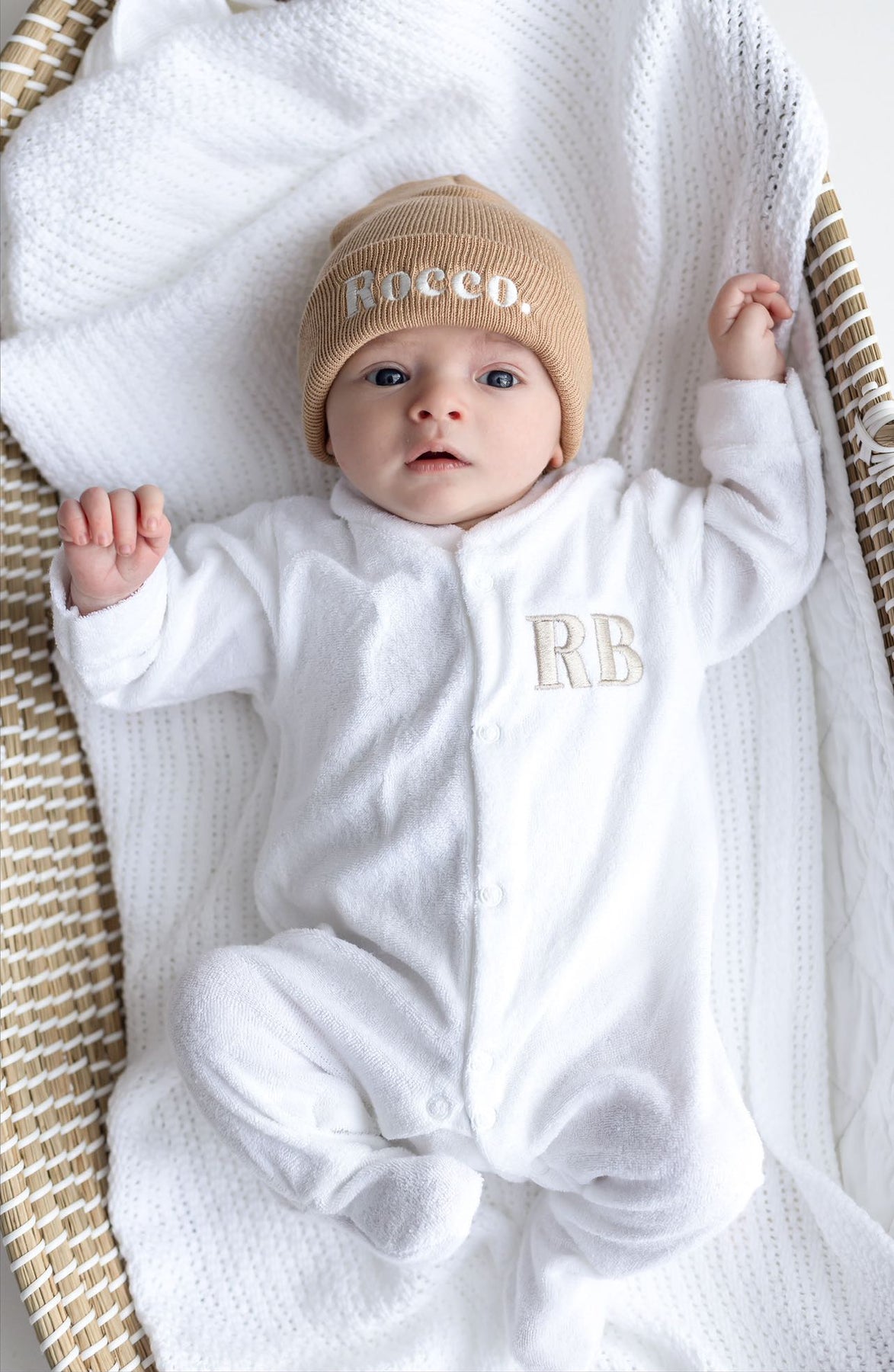 Wrap your little one in comfort and festive charm with our beautifully soft towelling romper. Featuring a convenient front popper fastening and a sweet embroidered candy cane initial, this romper is both practical and special.