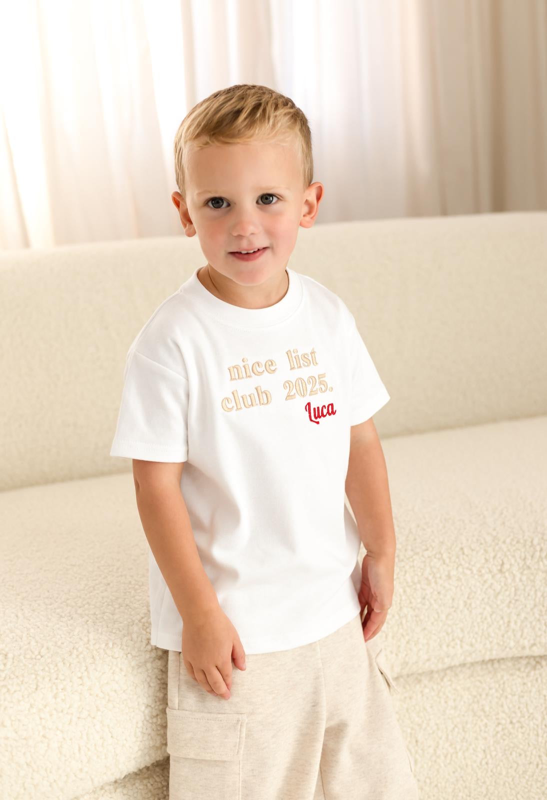 Make 2025 extra magical with our brand-new Nice List embroidery design, finished with a personalised touch just for your little one. Crafted from 100% cotton with short sleeves, it’s soft, breathable, and perfect for festive fun.